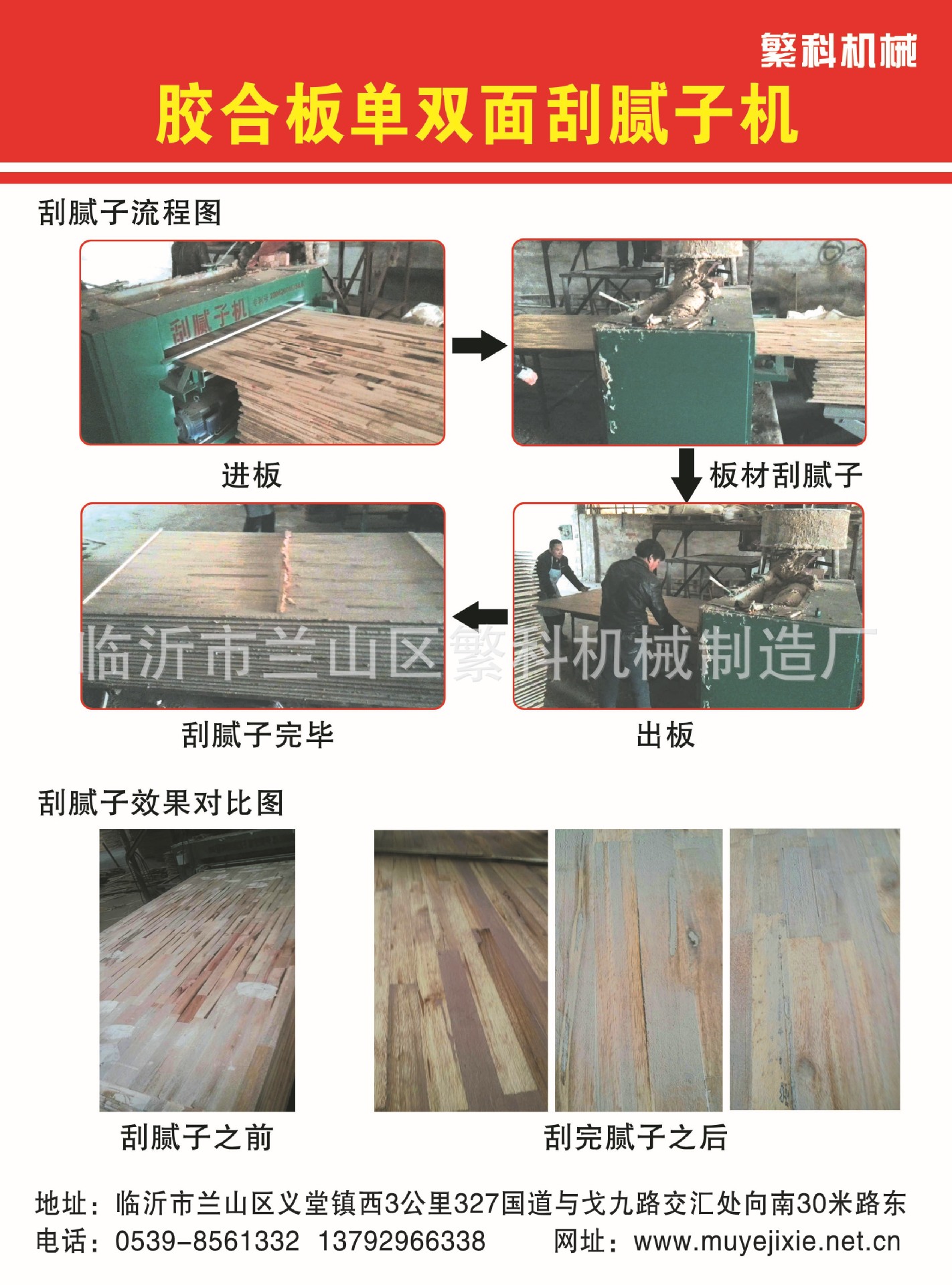 板材刮膩子機(jī)是“用膩子彌補(bǔ)板面表面缺陷”而發(fā)明設(shè)計的一種專用設(shè)備。主要應(yīng)用于對細(xì)木工板,多層板等板材有缺陷(坑洼,縫隙及凹陷等)的表面施加膩子進(jìn)行膩平,使其板面平整。它具有操作簡單,維修方便,工作效率高,外觀精致,打出的板面平整,質(zhì)量好等特點。使用該設(shè)備進(jìn)行生產(chǎn),一次性完成,生產(chǎn)效率高。減輕勞動強(qiáng)度,解放大批勞動力,降低產(chǎn)品成本,提高經(jīng)濟(jì)效益。并且給機(jī)床結(jié)構(gòu)合理,操作簡便,實為人造板廠家的理想選擇。